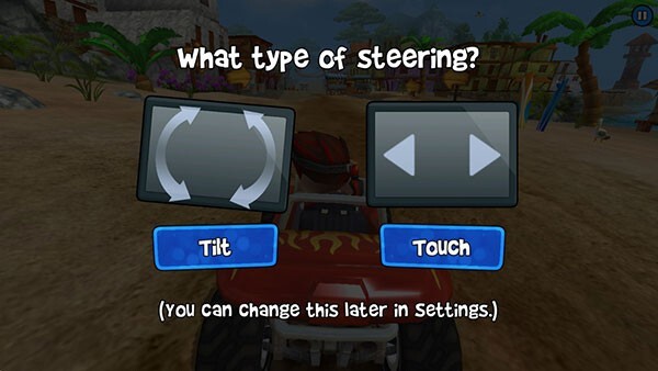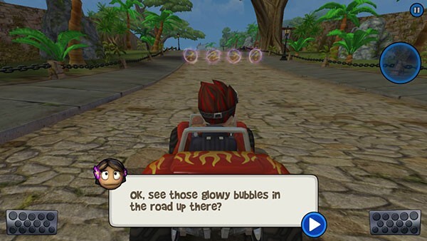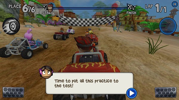 4、游戏采用自动加速设计,提供3种控制模式供玩家挑选,默认的重力感应控方向+全屏制动组合就能带来不错的体验。油门并非一踩到底(按住居然还能倒车),漂移过弯的前后阶段需要运用一定的刹车技巧,才能维持风驰电掣的快感。本作的道具系统完全遵循“卡丁车”的标准设定,赛道上会随机出现各类问号样式的Power-ups道具,每个角色也都拥有专属技能。在关键节点合理使用这些道具和技能,无疑能为你提供有力助力。