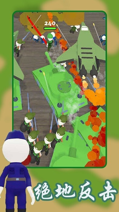 《绝地生存反击战》是一款卡通风格的生存战争模拟游戏。在游戏中,你将以指挥官的身份排兵布阵,通过建造兵营解锁不同兵种,并完成士兵升级,投身这场紧张刺激的战争!快来加入吧!!!