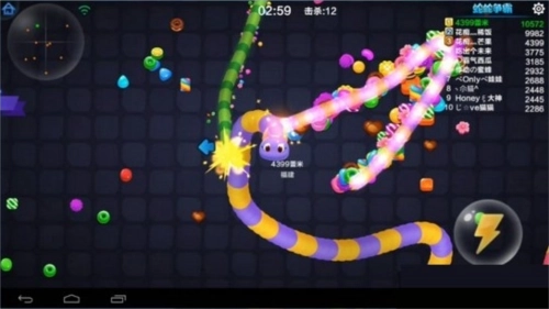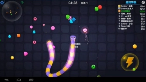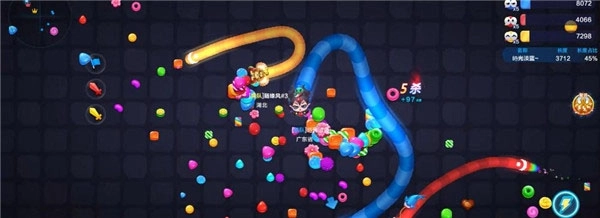 1、发育阶段:游戏开始的前一分钟,所有蛇蛇的体型都比较短小,此时击杀其他蛇蛇获得的分数不多,而且使用加速功能还会消耗分数,加上自身长度有限,很难对敌人造成有效的威胁。虽然可以尝试攻击,但这段时间更关键的是专注发育——吃掉那些闪亮的冰激淋块,能让你快速成长起来!
