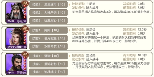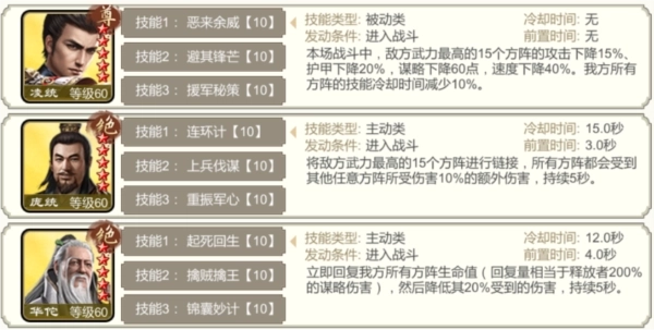 庞统携带“上兵伐谋”可缩短两名策士的五个主动技能的前置时间,其中连环计、起死回生、锦囊妙计均为核心技能,同时也能减少重整军心的前置时间;华佗携带“擒贼擒王”则可确保本队的输出能力。