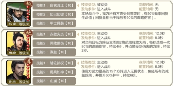 天子营选取吕蒙、周瑜、鲁肃组成羁绊,可获得谋略提升15%、护甲增加20的效果。