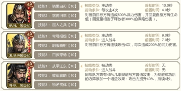 乐进、夏侯渊、蒋钦三人可激活“金弓骑三兄弟”羁绊,能为他们增加100点武力值与100点统率值。