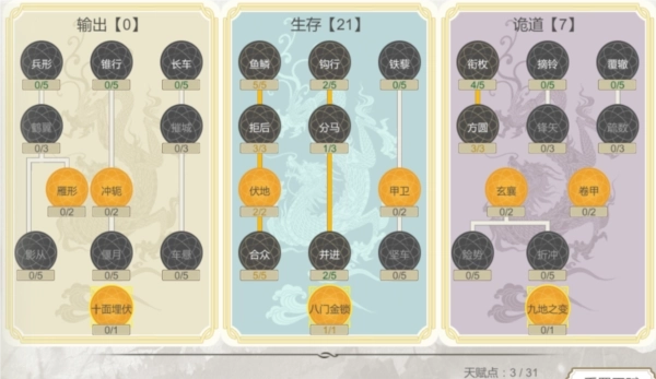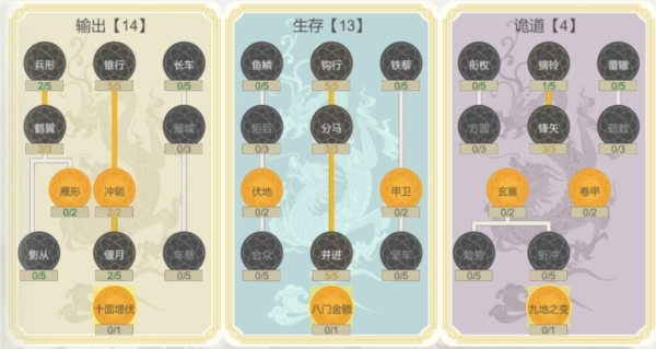 演武和重骑城的玩法类似,核心是把骑兵属性点到满级,同时要点出雁形阵;冲轭和分马的加点主要用来调整速度(通常这个城各点一点就够)。另外,由于弓骑、游骑和轻骑本身移速较快,这座城池不需要配备移速皮。