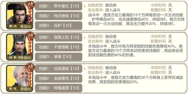 诸葛亮和左慈这两位武将堪称“万金油”,前者能提供技能减伤效果,后者可让敌方承受的伤害增加;建议为他们搭配辅助技能,同时给左慈配上“金鼓雷鸣”,以此确保队伍具备稳定的输出能力。