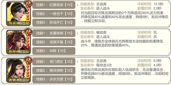 玄字营选用马云禄、吕玲绮、关银屏(张姬可替代)组成女骑队,可触发羁绊效果:攻击提升30点、护甲增加15点。