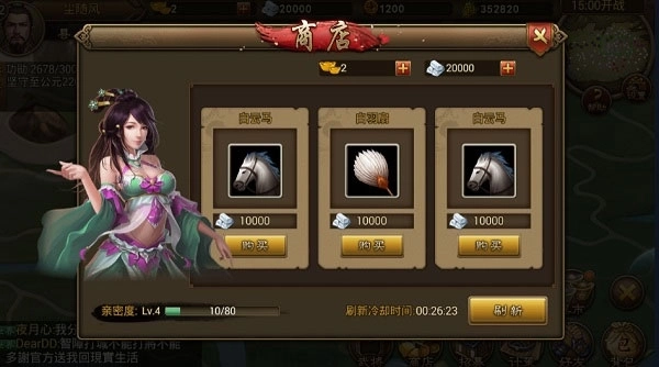 补充说明:商店购买道具需要花费银两以及元宝,元宝需要充值方可获得,银两则需要使用元宝进行兑换,每100元宝可兑换50000银两,另外,开启功勋宝箱也可获得。