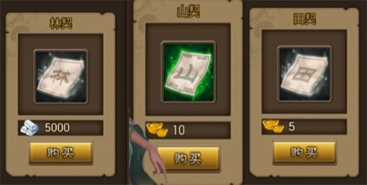 商店还有概率产出田契、山契、林契等各类契约,双击这些契约即可获得一定数量的粮草和铜钱。