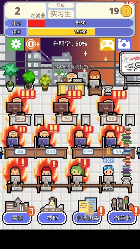 玩家需要用工作赚取的佣金提升自身的业务能力、口才、体力,以及职位晋升后所需的领导力——从初出校园的实习生起步,凭借努力争取更多发展机遇。若想在严苛的岗位要求下站稳脚跟、稳步晋升,除了过硬的业务能力,还得学会与上司周旋,参与各类社交活动来提高升职概率。这时,赚取金币以锻炼口才、社交等能力就显得尤为关键。游戏还设计了丰富剧情:玩家从实习生身份出发,通过承接更多工作、对剧情做出选择来拓展职业生存空间;随着能力提升,还能解锁技能系统,通过升级技能获得更高属性加成。