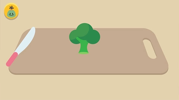 2、在下方挑选好你想要的食材,把它拖到菜板上。接着点击左边的刀具,然后对准食材滑动来切菜。切完之后,要是想回到厨房,点击左上角就行啦。