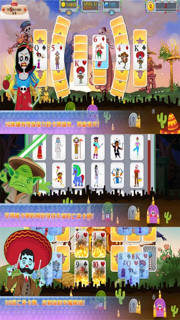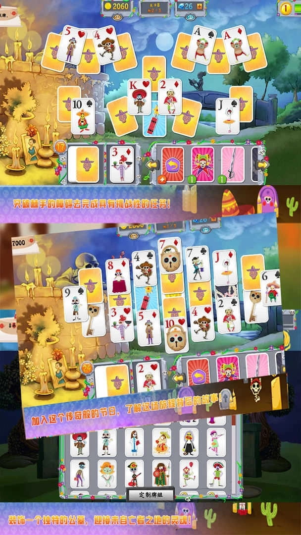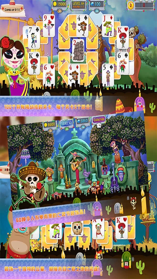 亡灵节纸牌是一款卡通风格的休闲游戏。玩家将踏入死亡之国,那里的骷髅与僵尸正欢快地庆祝死亡之日,你得和它们玩纸牌游戏。游戏规则很简单:在指定数字上叠加两张牌就能消除它们,上层的牌被消除后,下层的牌就会翻开。