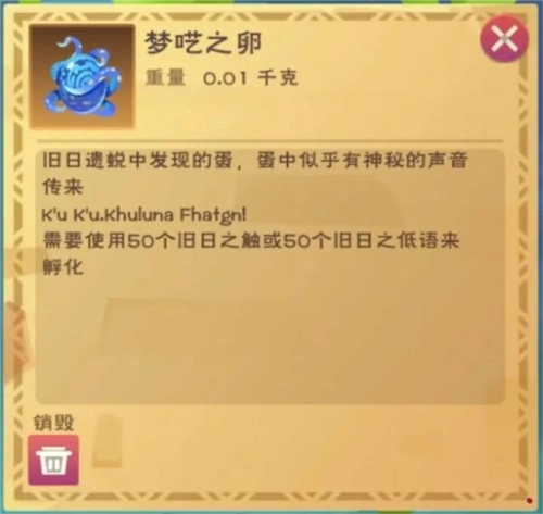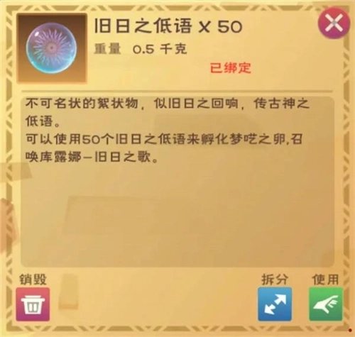 2.3孵化道具的获取与使用方法:当获得【梦呓之卵】后,消耗50个专属孵化道具——【旧日之触】或者【旧日之低语】,就能获取【库露娜——深渊之影】战宠或者【库露娜——旧日之歌】坐骑。