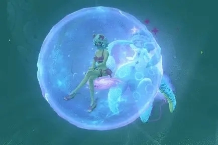 这款坐骑的主色调是淡蓝色,玩家乘坐时会被它制造的泡泡包裹住,坐姿是优雅的翘腿姿态,周身环绕着紫色烟雾与星星特效,整体气质十分出众。在体型上,库露娜是目前仅有的几款三栖坐骑中体格最娇小、高度最低的,日常使用时比富贵锦鲤和仙游浮鲲更不容易遮挡视野,使用起来要便捷不少。