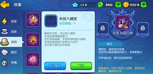 野蛮人大作战的宠物系统新添了圣宠与随宠两大板块。进入宠物界面后,带有【皇冠】标识的宠物就是圣宠,点击圣宠可进入其专属界面;当前版本里圣宠共有五只,后续还会陆续解锁更多。而点击随宠框会弹出随宠栏位界面,初始状态下随宠栏是锁定的,需要先进行解锁操作才能使用。