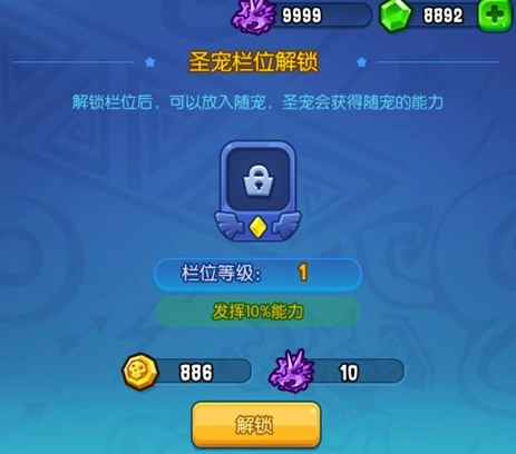 点击宠物栏后可对其进行升级,随宠栏的最高等级为10级。解锁第一个栏位需要消耗金币,后续的升级操作以及解锁并升级第二个栏位,则需要使用新增的“龙币”这一币种(龙币是圣宠获得多余碎片时转化生成的)。