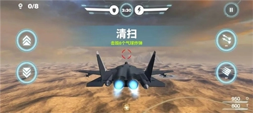 讲完硬性条件,我们来说说对战的一些小技巧。在清扫关卡中,如果防御力够高,不太需要担心敌机的伤害时,可以选择放弃躲避导弹,直接寻找气球炸弹,快速完成击毁任务。