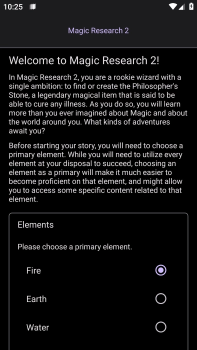 魔法研究2的完整版英文名是Magic Research 2,这款游戏借助文字描述来推进魔法研究进程。玩家能够收集丰富多样的元素,感受别具一格的游戏乐趣。游戏全程围绕魔法元素展开探索,本质上是一款点击类游戏——哪里出现光亮提示就点击哪里,并且通过升级对应元素来获取属性加成。快来一同探索这个充满魔法的世界吧!