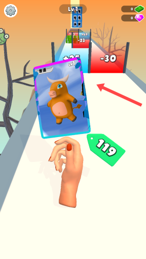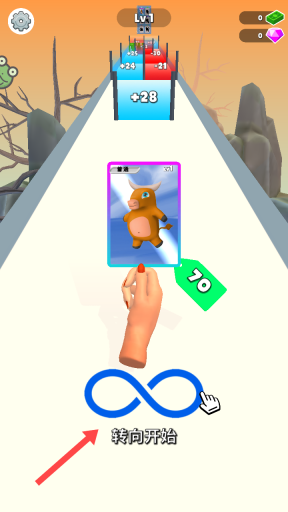 1、点击【转向开始】按钮,操控手中的卡片沿着指定路径行进,行进过程中优先选择带有【+28】这类加分标识的蓝色门,同时避开会减分的红色门,通过积累分数来提升等级。
