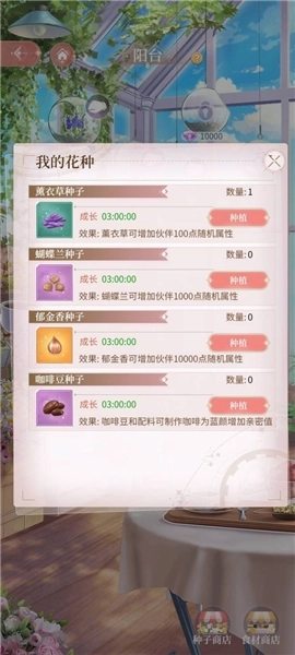悄悄和三小姐说个小秘密,在【阳台】种上薰衣草、蝴蝶兰还有郁金香,等它们开花的时候,用在伙伴身上,能给伙伴的属性带来不同程度的提升呢!