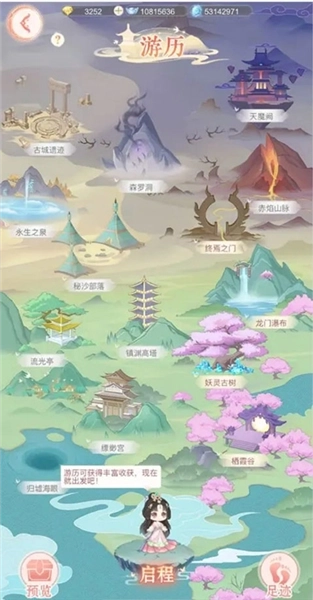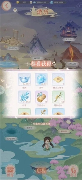 仙主大人们只需通关剧情1-9,就能开启游历玩法啦。进入【仙门】界面点击游历,就能看到所有可前往的游历地点,而且随着仙主大人主线剧情的推进,还会陆续解锁新的游历地图哦。在游历界面点击“启程”,就会随机前往已解锁的不同地点游历,每次游历最长可进行8小时,仙主大人们可以通过点击“足迹”查看已经收集到的材料。每个游历地点产出的资源各有不同,包括银两、灵气、仙草,还有一定概率获取各类珍稀物品呢;每个地点游历满10分钟就能100%拿到必得奖励,要是没满10分钟的话,可就无法获得奖励啦。
