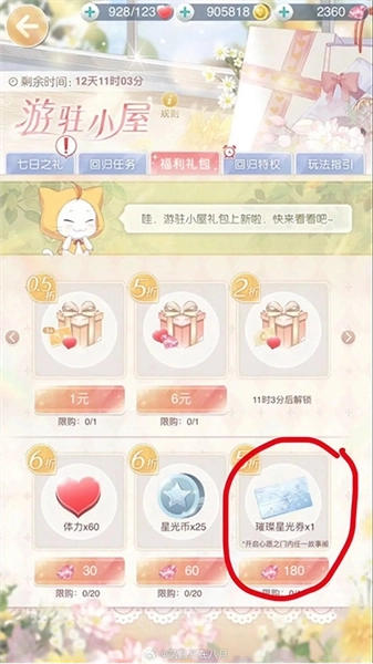 这里就涉及到璀璨星光券的获取途径(感觉有点像无限套娃);其一,老玩家回归礼包里会包含打折后的星光券。