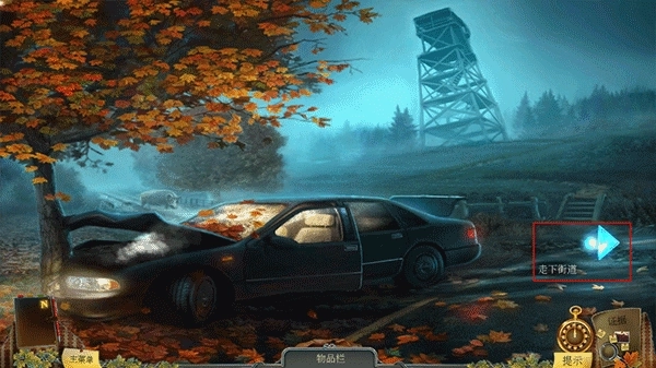 我们用车钥匙打开车子的后备箱,发现里面又有一个寻物游戏。完成游戏后拿到了断线钳,之后我们向右走,前往下一条街道,再穿过那座桥。