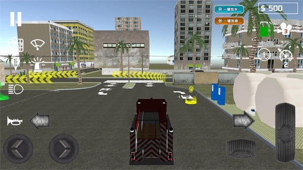 1、点击游戏主界面的中央方向盘按钮就可以开始驾驶消防车接受各种灭火任务了。