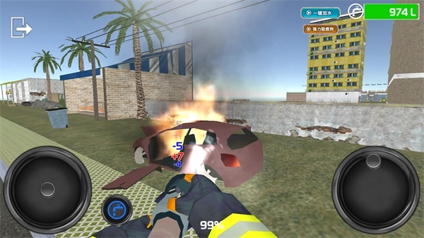 5、点击下方开启水龙头小按钮水枪就开始放水,需要通过摇杆控制方向并对准着火点进行灭火。
