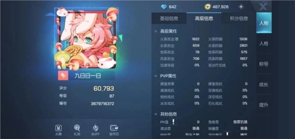 最后,每个职业都有自己的专属的系别攻击属性,这点我们需要知道,猎鹰是风系攻击,村雨是火系攻击,执行者是地系攻击,双生是水系攻击,而格斗家是火系攻击,这些我们在高级信息面板中可以看见。