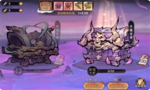 天魔劫开启时,“天魔宝匣”活动限时开启,玩家完成任务目标可获天魔秘钥、外域魔钥等道具,消耗这些道具可开启天魔宝箱,有概率获得功法-天劫血刀、功法-夺魂魔功、道兵-螭咬、古宝-九冥玄魔盾等珍贵奖励,开启宝匣还有概率获天魔核,积攒一定数量可限时兑换功法、道兵和古宝等。