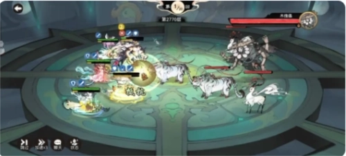 3、击杀前排虎妖:开局龙人正常承伤变身,反击造成大量输出;唐蝶衣大荒起手,斗酒解除龙人反向吸血debuff的同时,增强龙人攻击;无量和尚承受大量伤害,引发被动无敌,被唐蝶衣复活后吃到地藏被动刷新无敌,释放鸣金,开启法宝技能,继续刷新无敌;卫寒狂龙起手,天一剑典削弱前排虎妖血量。