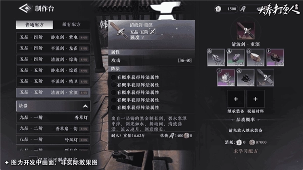 正所谓神兵可遇不可求,品质概率各不同,锻造兵器能打造出极品武器,但品质越高的兵器,打造的成功概率则越低。值得庆幸的是,打造“失败”并不意味着武器损坏了,只是无法产出更好品质的武器。