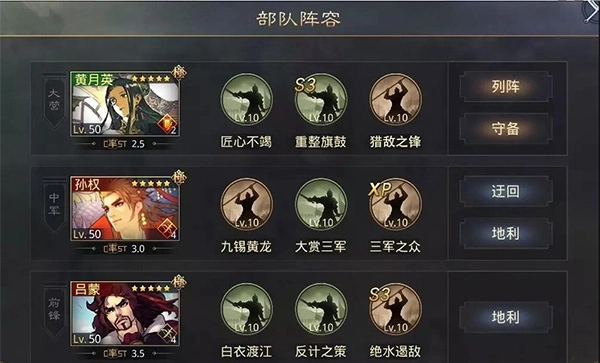 中军孙权带【大赏三军】和【三军之众】,为全队提供加成并恢复队伍兵力,担任辅助位置。