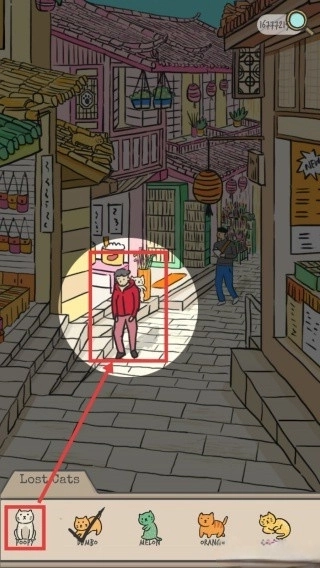 4.玩家利用放大镜道具照亮场景,仔细搜寻像穿着红色衣服任务身旁等可能隐藏毛谬的角落,找到目标猫咪。
