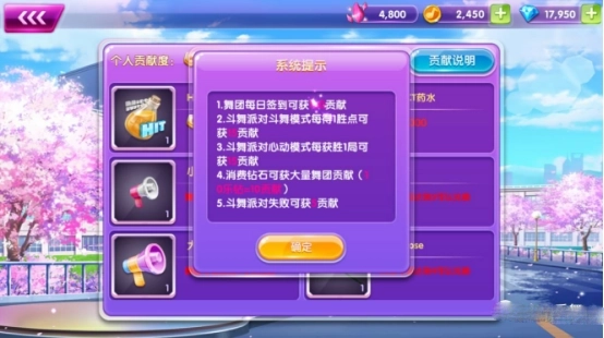 舞团中的玩家可以通过进行游戏签到等方式增加舞团贡献度,贡献度可以在舞团专有商店兑换道具物品。