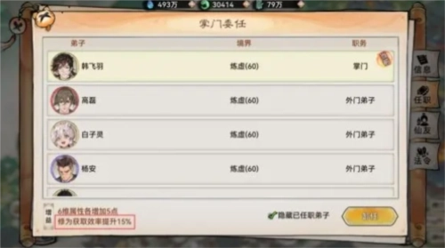 弟子在宗门任职,修为获取效率会得到加成。