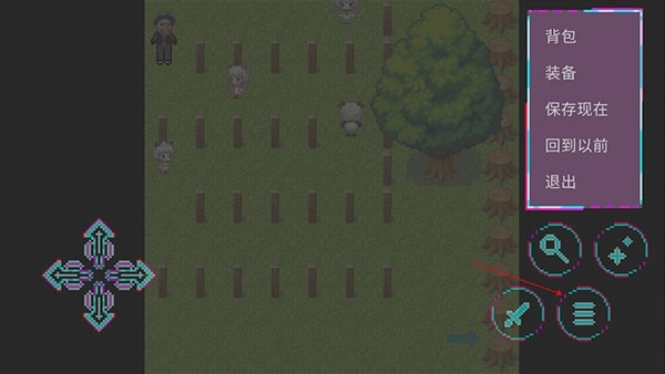 4、右下角的长剑表示攻击,点击图示处,呼出菜单,可以选择背包、装备以及保存进度并退出等。