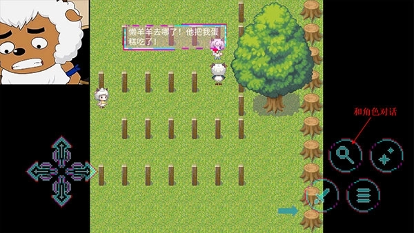 6、点击图示处,控制角色依次和作者大大、美羊羊、沸羊羊等角色进行对话,了解剧情。