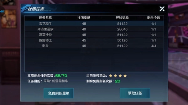 5、社团任务:每周最多可完成70次社团任务,完成后能获取丰厚的经验与社团贡献,任务星级越高,对应的奖励就越丰厚。每周有20次免费刷新任务星级的机会,格斗家们要记得先刷新到高星级再去接任务呀。