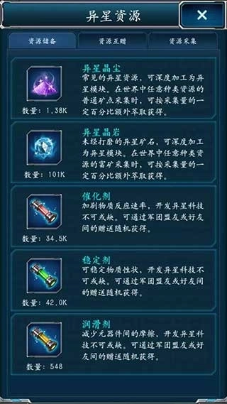 异星材料的数量直接关系到异星科技的发展,所以一定要记得每天挖一次白矿,晶尘挖满就可以停手了,别像我一样因为材料不足耽误升级。稳定剂和催化剂大家应该都囤了不少,但润滑剂却常常短缺。分享个小窍门:每天中午再去领取相关资源,而且要特意找等级低的领取;另外建议每天逛逛异星商店,说不定能遇到意外惊喜。