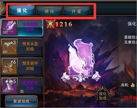 点击锻造菜单后,可以对装备进行强化,精炼和升星三种操作。其中精炼和升星需要相对应的材料,可通过攻击Boss获得。