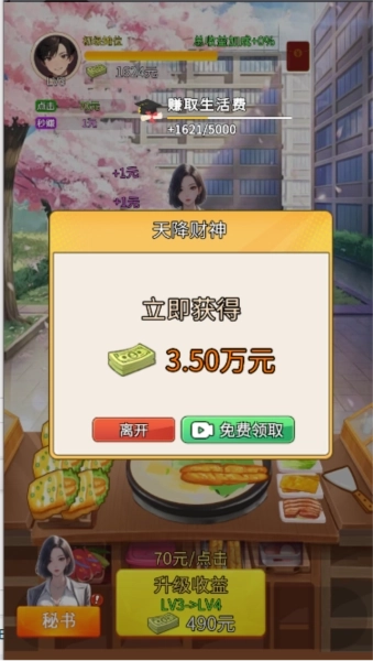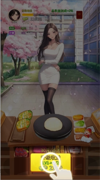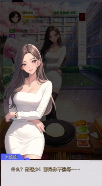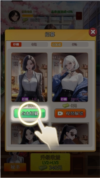游戏的核心玩法依旧围绕剧情推进展开,不过其中融入了多种模式:玩家得靠摆摊赚取资金,通过持续点击和招募秘书来积累更多财富,再用这些财富提升与女主的好感度以推动剧情发展,同时还包含关卡挑战的元素。可以说开发者把能想到的内容都整合了进来,整体稍显繁杂,但核心目标还是比较清晰的。