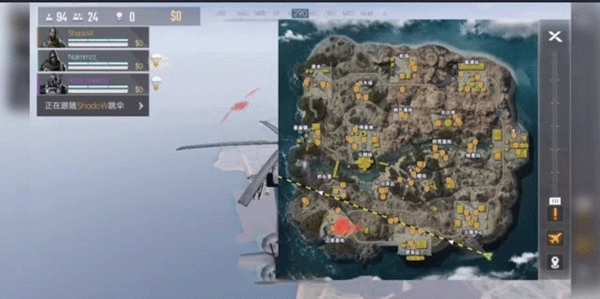 3、调整完毕后,玩家会与自己的三人小队及其他玩家一同乘坐同一架飞机,前往一座孤岛展开大逃杀游戏