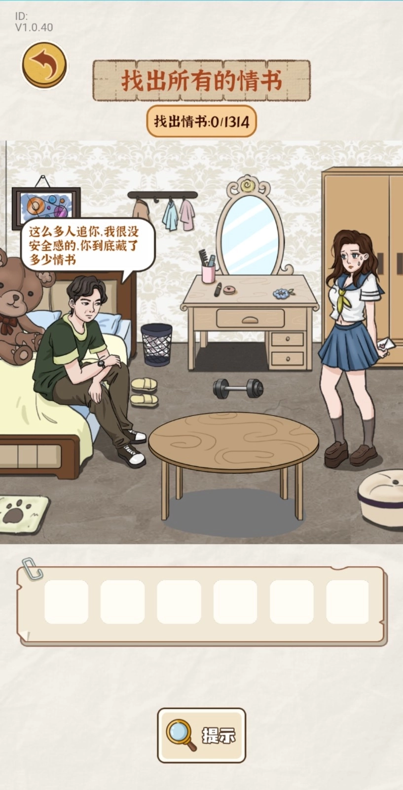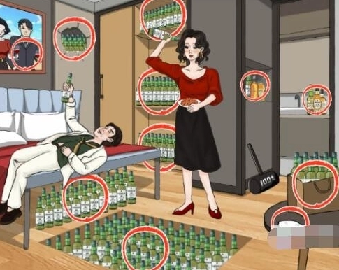 4、接下来点击购物小票,再依次点击合影、厕所、柜子、桌子上以及强哥手里的酒,把所有的酒都找齐就能顺利通关了。