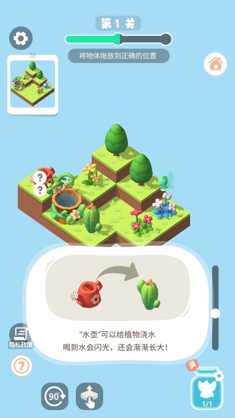 4、用水壶给植物浇水,植物喝足水后会发光并慢慢生长,拖动物品能自由布置,不需要时还可以收回。