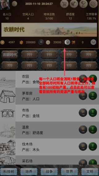 1、对城市功能分区进行规划,科学布局农田、茅草房、矿场等各类建筑,确保粮食、人口、资源能够稳定产出,为文明发展筑牢根基。