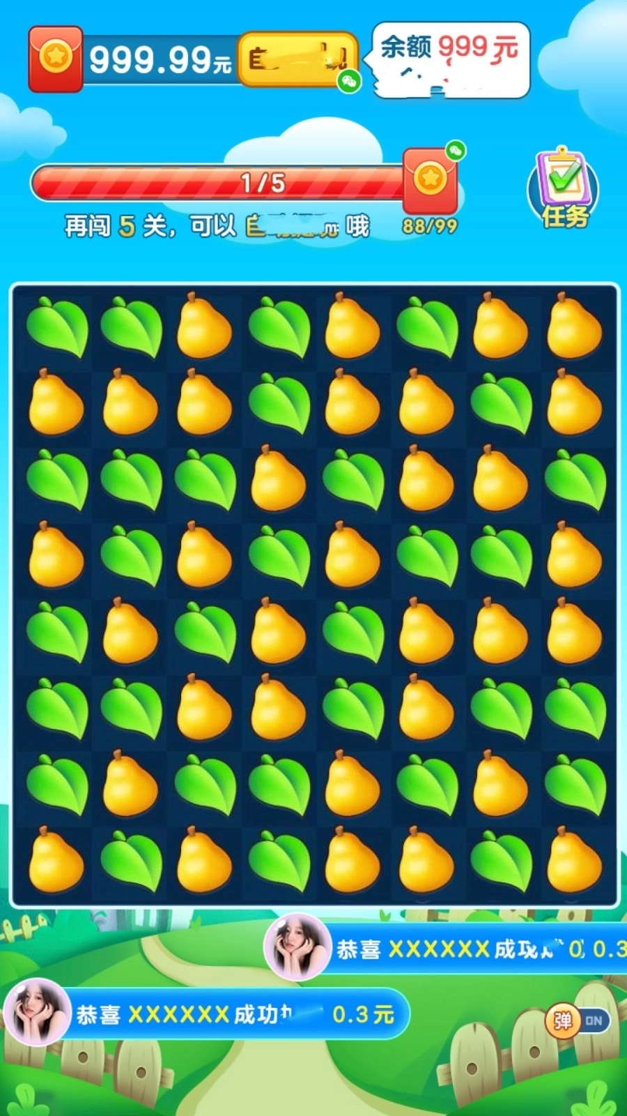 《我爱消水果》是一款超有意思的水果主题消除小游戏,创新的消除闯关模式搭配丰富关卡,延续经典玩法的同时,只需点击就能轻松消除通关。每通过一关都能领取红包奖励,解锁的关卡越多、消除的水果越多,红包金额也会随之增加。提现便捷快速到账,每天都能靠玩游戏赚点零花钱,让每位玩家都能真正实现娱乐赚钱两不误,快来试试吧!