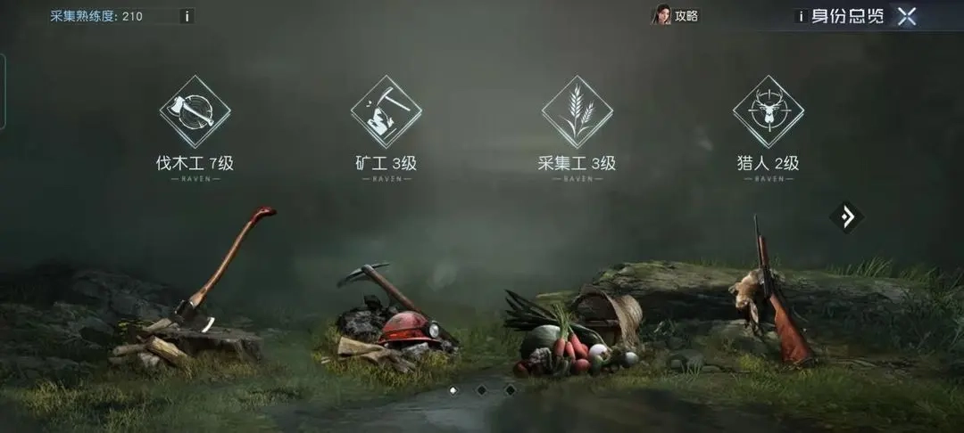 当前版本的身份系统包含12种身份,玩家可选择伐木工、矿工、采集工、猎人、厨师、渔夫、拾荒者、助教这8种。通过主界面上方的【菜单】-【身份】入口即可进入该系统。在游戏里完成对应身份的行动,就能积累熟练度与经验值,进而提升身份等级。每种身份都具备专属天赋,不同身份还能解锁各异的配方或图纸,可满足玩家在游戏中的多样化需求。
