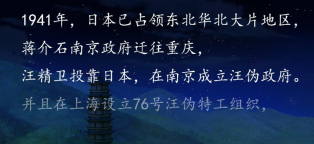 汪精卫背叛国家、投靠日本侵略者,在南京建立伪政权,同时在上海设立了臭名昭著的汪伪特工总部“76号”,对大量爱国志士进行残酷迫害。