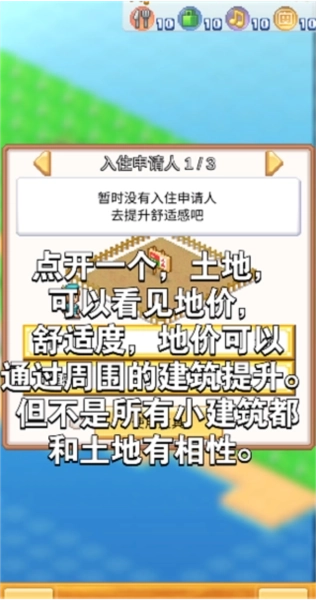 2、接下来可以开发任意几块土地,点击土地可查看地价、舒适度等信息,其中地价可借助周边建筑的相性获得提升,但需注意并非所有建筑都与土地存在相性。