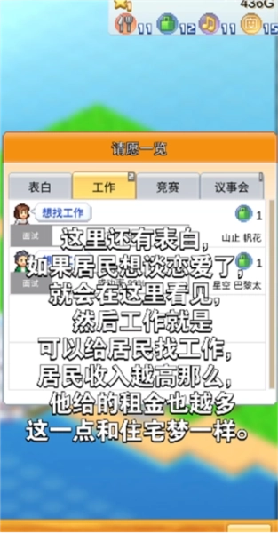 4、居民会有入职、参赛、提出新建筑构想等需求,建议每隔一段时间查看居民状态。特别措施里的联谊功能要常使用,居民结婚后可同居,两人存款会合并计算。他们生育的孩子长大后会成为新居民,且初始居住的都是豪宅;若居民不生育,后期社区的居民数量、居民等级以及租金收入都会大幅减少。
